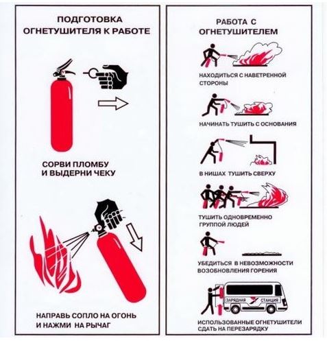 Каждый человек должен знать, как устроен, как действует огнетушитель, и уметь обращаться с ним. В начальной стадии пожара огнетушитель может спасти жизнь и имущество, когда требуется потушить небольшое возгорание или удержать распространение пожара до прибытия пожарных. Однако они бесполезны при тушении большого огня. - Приобретите огнетушитель, которым Вы сможете потушить пожар в момент его возникновения. - Огнетушитель должен быть такого веса, чтобы члены семьи были способны им тушить. Огнетушители разделяются на следующие типы: Пенные. Для тушения горючих жидкостей (бензин, масло, лак, краска) и очагов пожаров твердых материалов на площади не более 1м2, за исключением установок, находящихся под напряжением; Порошковые. Для тушения загораний легковоспламеняющихся и горючих жидкостей, лаков, красок, пластмасс, электроустановок, находящихся под напряжением до 1000 вольт; Углекислотные. Для тушения различных веществ и материалов, электроустановок под напряжением, любых жидкостей. Эти огнетушители не имеют себе равных при тушении пожара в архивах, хранилищах произведений искусств. Использование. 1. Сорвите пломбу, выдерните чеку, направьте раструб на очаг возгорания и начните тушение. 2. Огнетушитель следует держать вертикально. 3. Огнетушитель должен храниться вдали от отопительных приборов и прямых солнечных лучей, при средней температуре, вне досягаемости детей.
