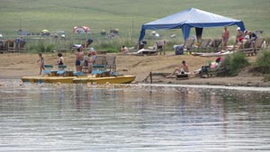 Вступил в права купальный сезон на знаменитых ширинских озерах с самым притягательным для отдыхающих месяцем – июлем. Однако гости района не замедлили воспользоваться и жаркими июньскими днями. По двум трассам Абакан – Шира и со стороны Красноярска помчались стремительные потоки автомобилей. На базах отдыха и в палаточных городках увеличилось количество тех, кто спешит пожариться под солнцем и поплескаться в лечебных водах Шира, Беле и озера Тус. Впрочем, и другие берега уже не пустуют. Стремятся воспользоваться моментом для съемок достопримечательных уголков и тележурналисты. Целый ряд сюжетов в Хакасии снял авторитетный канал НТВ. Абаканское губернаторское телевидение, названное так в кругах зрителей, заинтересовалось историей рудника «Киялых – Узень» и знаменитым Туимским провалом. Съемочная группа красноярского седьмого канала выясняла, почему тысячи жителей краевого центра предпочитают ехать на озеро Беле. Конечно, великих секретов в этом вопросе не таится. Люди, не имеющие средств отправиться на моря и острова в океане, предпочитают потратить несколько часов в дороге и оказаться в благословенных уголках Ширинского района, чтобы получить порцию солнца, воздуха и воды, по возможности поправить здоровье. Привлекательным становится и возрастающий комплекс услуг, которые предоставляют многочисленные хозяева земельных участков. За относительно невысокую плату, а ведь люди специально подкапливают деньги на удовольствия, можно воспользоваться прокатом лодок и водных велосипедов, прокатиться на «плюшках» и «бананах», скатиться с катушек и отправить детей в мини – бассейны. Есть возможность совершить и всевозможные экскурсии. О торговле и общепите и говорить нечего: хочешь – покупай дрова для костра, хочешь – в ночной клуб отправляйся.