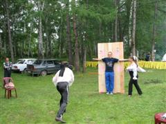 О времена! О нравы! Можно ли представить отдых нынешней молодежи без сигареты в зубах и бутылочки пива в руке? Явление из разряда фантастических, скажут многие. Но стоит ли обобщать? К примеру, его величество футбол не только не теряет популярность, совсем наоборот, ряды поклонников растут, особенно сильно среди слабой половины человечества. Не чужды молодой поросли и активноый отдых на природе, и песни у костра под перебор гитары. Так значит, есть и другая молодежь: активная, инициативная, задорная! С двадцать девятого по тридцатое июля в селе Ефремкино проходил III молодежный фестиваль «Огонь сердец молодых». Несмотря на свою небогатую историю, он полюбился многим парням и девчатам Ширинского района. Во-первых, из-за места проведения: село Ефремкино расположилось в удивительном по красоте месте. Во-вторых, задорные и активные ребята знакомятся, общаются, а проще говоря, тусуются со сверстниками со всего Ширинского района. И, в-третьих, ни один фестиваль не похож на предыдущий. «Мы уже это видели» - это не про «Огонь сердец молодых». Задумывавшийся как слет исполнителей бардовской песни, сегодня фестиваль существенно расширил границы, отчего стал еще интереснее. С самого утра на поляне около Ефремкино кипела работа, командам предстояло разбить палатки, отрепетировать визитные карточки к открытию - времени на раскачку не было. Ровно в двенадцать первый заместитель главы района Людмила Ремкевич и начальник управления культуры, молодежной политики и спорта Василий Таланов поздравили молодежь с открытием фестиваля, пожелали успешных выступлений и достойных побед. Первый конкурс - визитная карточка. И зрители, и участники понимают, легкой прогулки не будет. Первыми вышли на сцену ребята из села Ворота. Феерическое выступление поддерживается бурными аплодисментами - выступили на пять. Неплохо отыграла команда Районного дома культуры, их визитка напоминала КВН. За Ефремкино спели походную песню студенты из Томска. Но зрители, несомненно, ждали визитку целинников, уж очень ярко и пестро выглядела команда. Думали увидать визитку, а посмотрели настоящее цирковое представление. Пока одна половина присутствующих гадала, настоящая ли змея обвивает девушку, вторая с замиранием сердца наблюдала за представлением метателя ножей Александра и его ассистентки Елены. Продемонстрировав на супруге мастерство, Александр предложил смельчакам заменить ее. Публика была в восторге, остались ли в восторге смельчаки? Да, - говорю с полной уверенностью. А вот загадка со змеей разрешилась довольно быстро - императорский краснохвостый удав соизволил пошевелиться. В итоге, первое место в конкурсе визитных карточек досталось РДК, на втором - Ворота, третьими стали ефремкинцы.