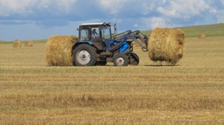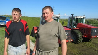 С утра до позднего вечера ведут заготовку сенажа полеводы ООО «Джирим – Агро». Именно такой ритм задает август, когда на счету каждый погожий час и в самом соку кормовые культуры. В этом году было решено подготовить старую траншею объемом примерно на пять тысяч тонн рядом с животноводческим комплексом. И именно сюда спешат тракторы с телегами, автомобили. На трамбовании зеленой массы днем и в ночные смены задействованы два новых мощных «Кировца», которые были приобретены зимой по целевой программе закупок техники. Директор хозяйства Павел Томчик и агроном Василий Сюсин, не сговариваясь, рекомендуют сфотографировать молодых механизаторов Алексея Хулапа (на снимке слева) и Александра Гартвиха. Оба прекрасно понимают, как много от них зависит в эти дни, а еще больше - зимой, когда потребуется качественный, со всеми необходимыми добавками, корм. Пока шла фотосъемка, подъехал на новом КамАЗе один из лучших джиримских водителей Владимир Унтерберг. «Давай-ка, нас с весовщицей сфотографируй», - предлагает давний знакомый. А что, жалко? Пожалуйста! И рядом с ним Татьяна Алексашина, настоящий командир участка, как ее назвали. Близость траншеи к коровникам выгодна вдвойне, особенно в экономии средств на горюче – смазочные материалы. Если еще в прошлом году на одну машину требовалось до 50 литров горючего для доставки сенажа от мест хранения, то теперь, по заявлению специалистов, понадобится пятнадцать – двадцать. Примерно такую же операцию проводят и с сеном. Рулоны завозятся непосредственно на территорию комплекса, а на полях тракторист Николай Мячин (на снимке) на «Беларусь» цепляет сразу по два рулона. Это придумка местных умельцев: приварили сзади два клыка, а в результате механизаторы сократили пробег и экономят горючее. И шоферам не надо за каждым рулоном мотаться по участкам – все в одном месте. Выгодно и то, что зимой не надо будет гонять трактора по полям, пробивать дороги в сугробах. И опять прямая экономия на затратах.  На 23 августа в Джириме было убрано зеленой массы на сенаж 6368 тонн, прибавка за одну неделю составила около трех тысяч тонн. С 640 гектаров заготовлено 4458 тонн ценного корма. На эту же дату заготовлено 1050 тонн сена. Травы скошены на 2805, а убраны с 1470 гектаров. Результат несколько ниже, чем в прошлом, году, но и погодные условия не сравнишь, тем более, что в хозяйстве резко увеличены площади подготовленных паров и вспашка залежей:, 2328 и две тысячи гектаров соответственно. На части из них и вели заготовку сена. Тем не менее, в коллективе уверены в главном: кормовая база на зимний стойловый период будет достаточной. Василий ИВАНЧЕНКО Фото автора