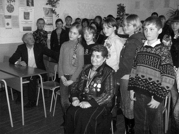 В каждом учебнике истории можно найти хронологические описания тех страшных лет, какими были годы Великой Отечественной войны. Но в книгах описаны военные действия, а не жизнь людей в то тяжкое время. В школе №17 с. Шира прошла встреча учеников с Прасковьей Яковлевной Лосевской. Она более полутора лет провела в концентрационном лагере. Прасковья Яковлевна начала с рассказа о родителях. Война застала их в Харькове. Их эвакуировали на Дон. Там Прасковья Яковлевна жила с прадедом и прабабушкой. А отца перевезли в город Красноярск, вместе с заводом, который во время войны производил танки. Так как отец был хорошим специалистом, его не призывали на фронт. Но когда дошли вести, что немцы оккупировали Дон, пошел добровольцем. Прасковья Яковлевна, несмотря на то, что была еще маленькой, хорошо запомнила то время. Она много рассказала интересного о деревне, в которой они жили и о военных действиях. Линия фронта проходила недалеко от кукурузного поля за деревней. Она рассказала о том, что ребятишки работали связными. Сама лично переносила записки в сандалиях. Когда немцы заняли деревню, кроме женщин и детей в ней никого не было. Ну еще старики. Женщин и детей постарше выгоняли на работу, а маленькие ходили по полям и собирали растущий в кукурузе паслен и дикий томат. Враги не обращали внимания на них, и дети переносили записки. Там, на краю поля, говорит Прасковья Яковлевна, была коряга под ней и оставляли весточки. Потом немцы узнали и сожгли деревню дотла. А всех жителей согнали в бараки и заставляли работать. Но и здесь в этом, казалось бы, безвыходном положении находились минуты радости. Прасковья Яковлевна говорит, что охраняли их не только немцы, но еще и итальянцы, мадьяры. Итальянцы были самыми гуманными по отношению к пленным. Они отдавали им свои продукты. Макароны из чашек вываливали прямо женщинам в подолы, чтобы они могли покормить детей, приносили старую одежду. В сорок втором году Кантемировская дивизия освободила Дон, и естественно, тех, кто сидел в лагере. Все жители вернулись в родную деревню. Женщины работали, не покладая рук в полях, дети наравне с ними пололи, тяпали. А те, кто помладше и не годился для тяжелой работы, бегали по округе и играли гранатами и боеприпасами, оставленными немцами после отступления. Да и в полях было много мин, люди погибли от этих зарядов, много покалечилось детей. Прасковья Яковлевна пошла в школу с семи лет. Тетрадей не было, писали на чем придется. Одежды тоже не было, одевались, кто во что мог. Носили сапоги 46 размера, другой обуви просто не было. Страна была полностью разрушена, мужчин было мало, многие погибли на фронте. Нормальный хлеб, без всяких примесей, Прасковья Яковлевна попробовала только в 1951 году. После школы она выучилась и работала лесничим на Дальнем Востоке. Вышла замуж и с мужем переехала в Черное Озеро. Работала лесником и здесь. Когда леса горели, а было это явление ежегодным, то решение пришло им с мужем неординарное. Они организовали школьное лесничество. В 1968 году таковое появилось под названием «Орленок» и было одним из первых в СССР. На протяжении двенадцати лет тайга вокруг их деревни не горела. За этим следили мальчишки и девчонки. За время своего существования школьное лесничество засадило деревьями разных пород семь тысяч гектаров тайги. Потом в семью пришла беда. Муж тяжело 
