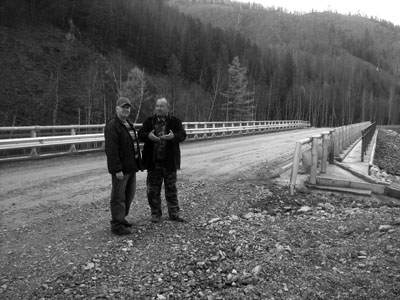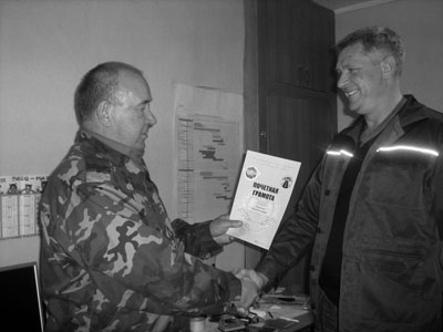 В тот рабочий день у строителей было несколько праздничных минут. Григорьев привез приказ и Почетные грамоты министерства транспорта и дорожного хозяйства Республики Хакасия. Среди награжденных бульдозеристы Владимир Белый и Иван Ведерников, Владимир Гуркин и Олег Тимченко, экскаваторщики Александр Андреев и Владимир Шиляев, водители Александр Ежов, Сергей Коков и Андрей Первушин, газоэлектросварщик Александр Чупин. Не забыты механики, мастера, прорабы. Например, механик Сергей Добрыднев (на снимке с Григорьевым - справа), которого мы нашли уже вечером в Шира, где он принимал жилые вагончики на железной дорорге. Правда, не всем грамоты вручались на месте: кто-то на трассе, кто-то и вовсе не на вахте, а дома. Что поделаешь – такой ритм, когда месяц работаешь, месяц отдыхаешь. Зато и заработная плата вполне приличная – трудные условия этого стоят. На трассе счет идет на миллионы отсыпанных и уложенных в полотно кубометров грунтов и гравия. Напомним, что здесь работает двенадцать субподрядных организаций, в том числе команды Алтайского и Ширинского дорожно – строительных управлений. Напомним и то, что к шести метрам проезда необходимо прибавить по два метра с обеих сторон. Насыпи в иных местах поднимаются на десятки метров, крутизна и петли из проекта исключаются. Ведь марганец повезут на большегрузных автомобилях. И уже сейчас проезд здесь возможен только по пропускам, чревато последствиями. Рассказывают, что какой-то «крутой водила» на иномарке чуть в ковш не врезался, спасло бедолагу мастерство экскаваторщика. Так что для любителей «посмотреть» есть шлагбаум. Да и нечего здесь делать любопытным – они помеха на пути к ручью Чек-су. Здесь взрывают откосы и скалы, здесь прокладывают путь к новому рывку в социально – экономическом строительстве района, Хакасии, Сибири и России.