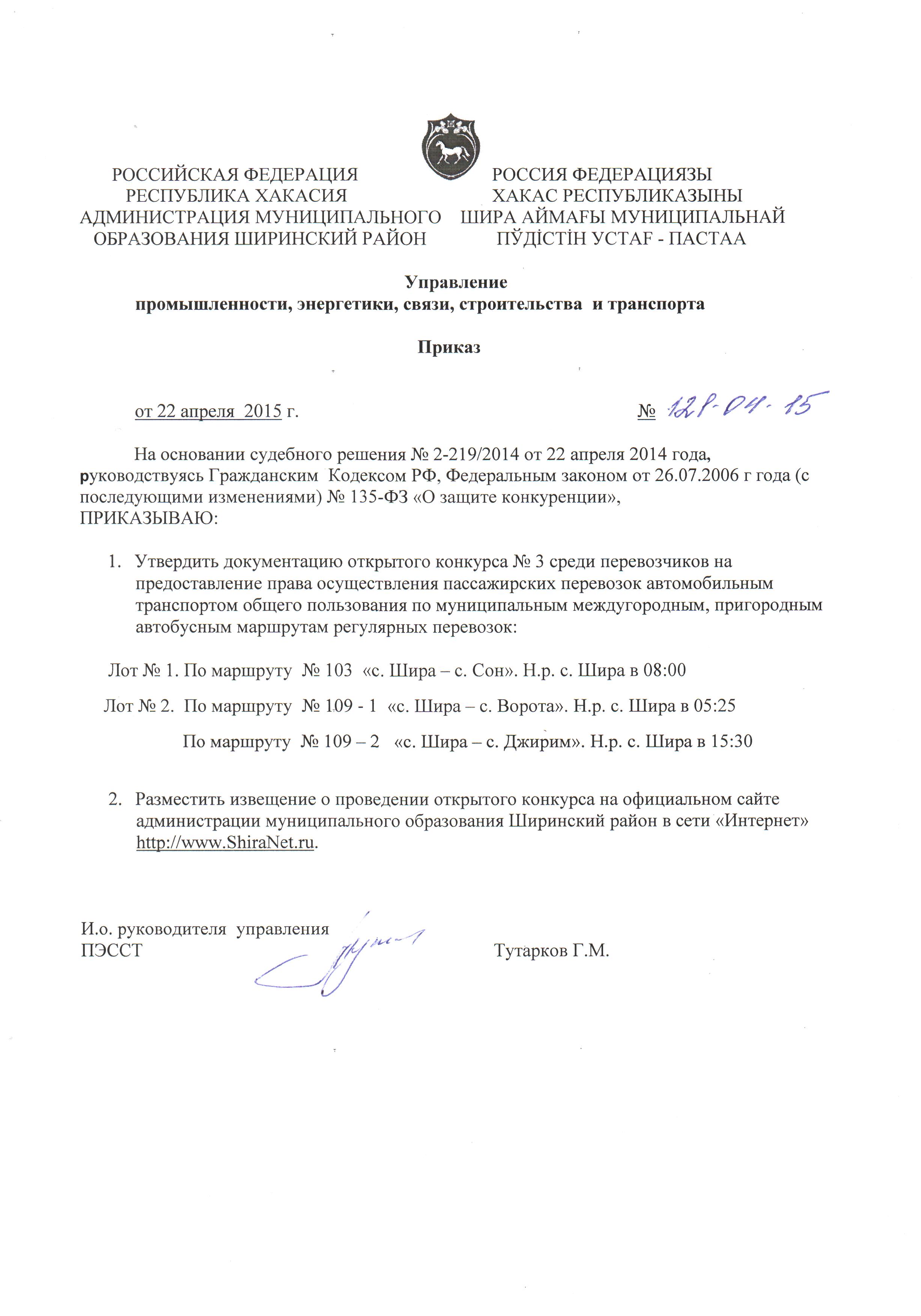 22 апреля 2015 г.с. Шира 1. Информация о заказчике: Управление промышленности, энергетики, связи, строительства и транспорта администрации муниципального образования Ширинский район. Место нахождения: Республика Хакасия, Ширинский район, с. Шира, ул. Октябрьская, 79. Почтовый адрес: 655200, Республика Хакасия, Ширинский район, с. Шира, ул. Октябрьская, 79. Адрес электронной почты (E-mail): vek_19@mail.ru. Лот № 1.По маршруту № 103 «с. Шира - с. Сон». Н.р. с. Шира в 08:00 Лот № 2. По маршруту № 109 - 1 «с. Шира - с. Ворота». Н.р. с. Шира в 05:25 По маршруту № 109 - 2 «с. Шира - с. Джирим». Н.р. с. Шира в 15:30