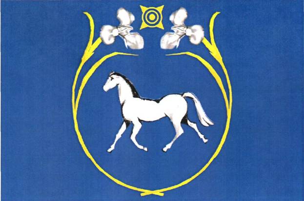 Прямоугольное полотнище синего цвета с отношением ширины к длине 2:3, в центре которого круглый, разомкнутый вверху венок из двух ирисов белого цвета на длинных стеблях жёлтого цвета; внутри венка – бегущий к древку конь белого цвета, вверху, выше разрыва венка – солярный знак (виде круга и двух концентрических окружностей, от внешней из которых отходят диагонально четыре коротких луча) желтого цвета.