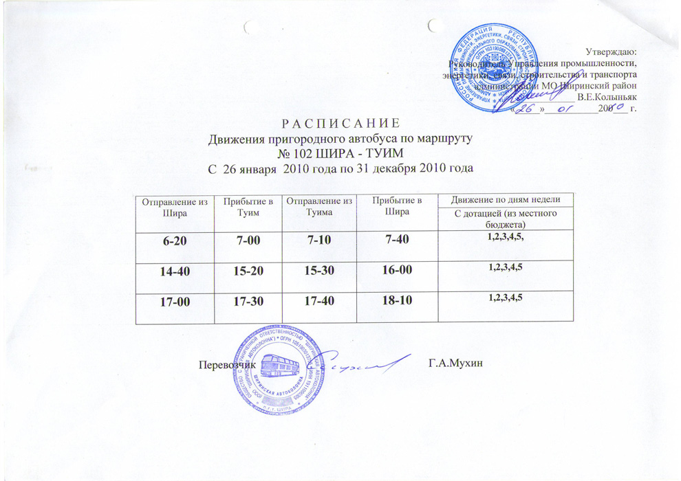 Расписание движения пригородного автобуса по маршруту № 102 ШИРА-ТУИМ